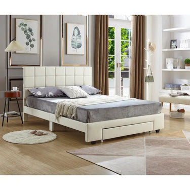 Bring a touch of modern elegance to your bedroom with this white PU queen bed. Its clean lines and square-tufted headboard instantly elevate the room, creating a polished, hotel-inspired look.