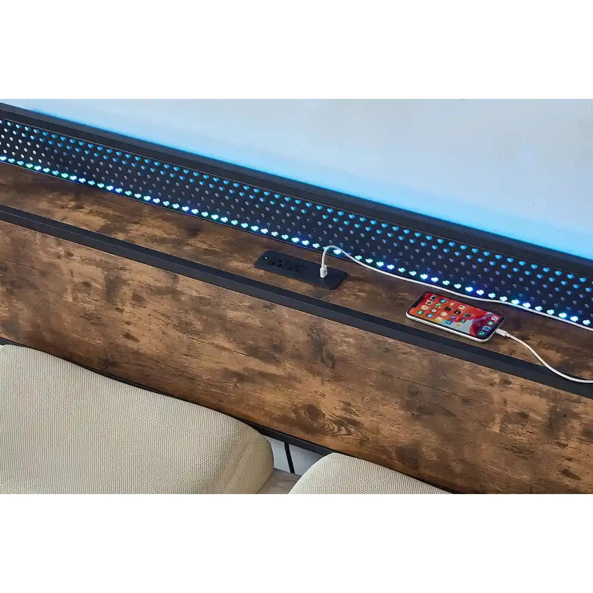 The wood grain panels and sleek metal frame bring rustic charm with a modern edge. The headboard includes a clever storage ledge, perfect for books, glasses, or a cup of tea. Right beside it, you’ll find a built-in charging station with 2 outlets, 1 USB, and 1 USB-C port. No more stretching cords across the room. Your phone, tablet, or lamp can stay powered, right where you need them.