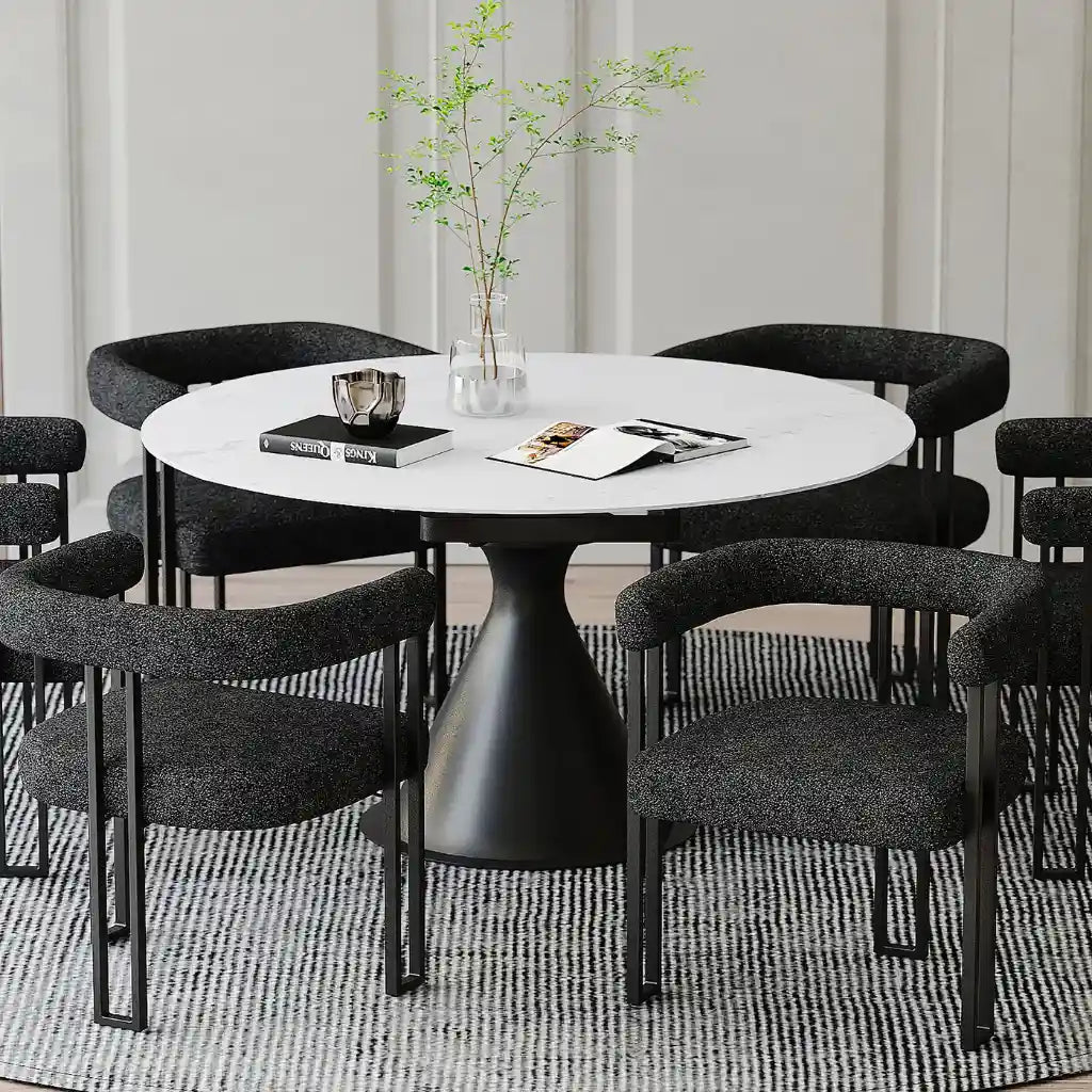 Revamp your dining space with the Calisto Extendable Round Dining Table - where style and function meet. This modern centerpiece includes a smooth, stain- and scratch-resistant sintered stone top polished with a luxurious marble finish, designed to elevate everyday dining.