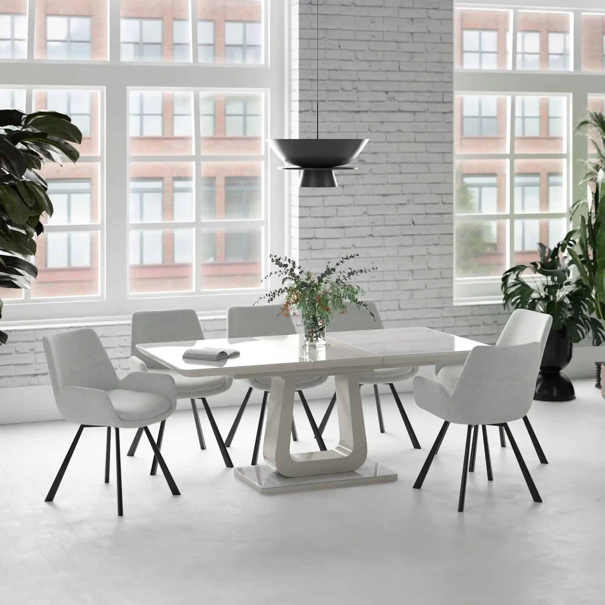 Central to this set is a large warm grey toughened glass table, which has a striking high-gloss finish to the edging. It's a unique one-handed cement extension system that effortlessly opens up space for more plates, then closes back up when you’re finished for a cool and contemporary two-tone look. Its sculptural U-shaped pedestal base makes an eye-catching style statement while combining the clean lines of modern design with the stability of a rock-solid stance.