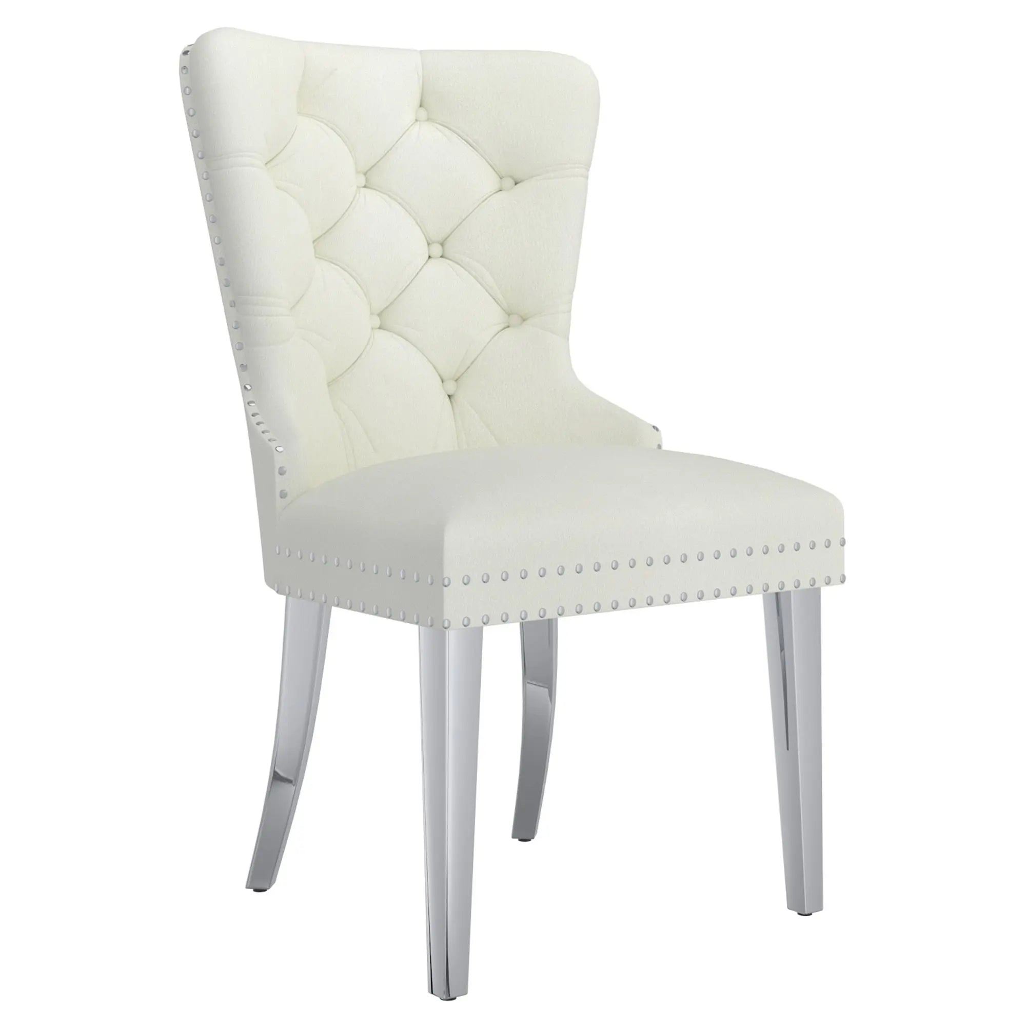 • Ivory velvet chairs with sophisticated button tufting and chrome ring accents