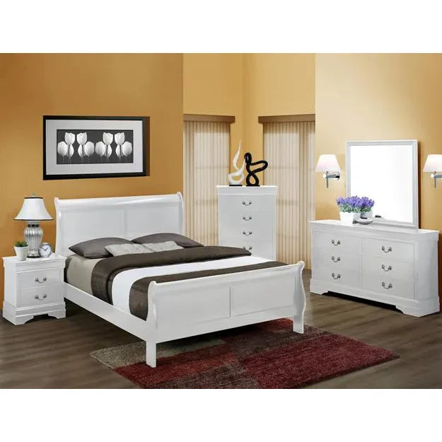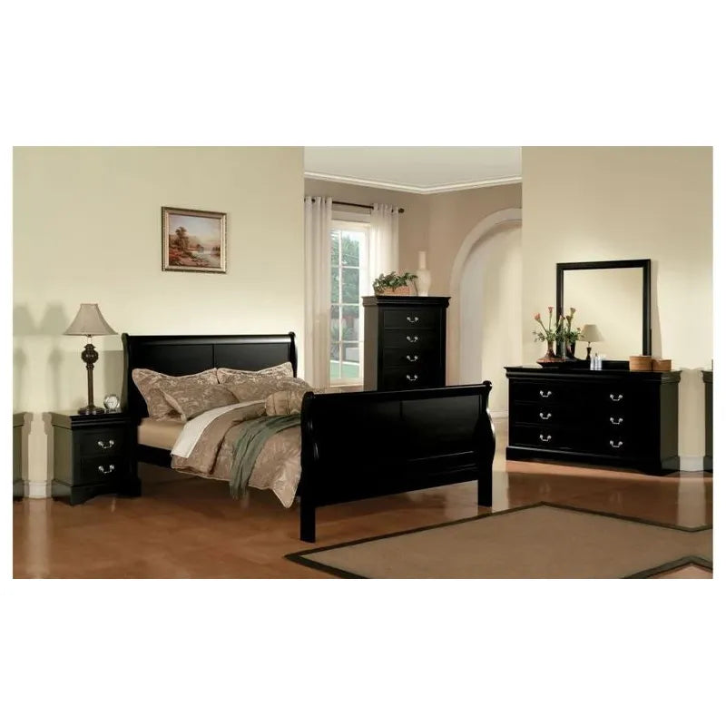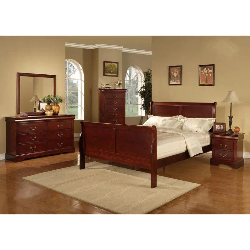 Ensemble de chambre à coucher Louis-Philippe à lit traîneau disponible en 6 ou 8 pièces. Comprend un lit, une commode avec miroir, des tables de chevet et une commode. Disponible en tailles double, queen et king.
