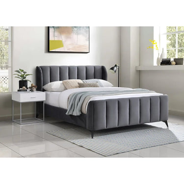 The IF-5120 queen bed is designed with a contemporary edge. A padded wing headboard with vertical tufting adds a soft yet structured feel, making it perfect for leaning back while reading or winding down at night. Upholstered in rich grey velvet, it brings warmth and sophistication without ever feeling heavy.