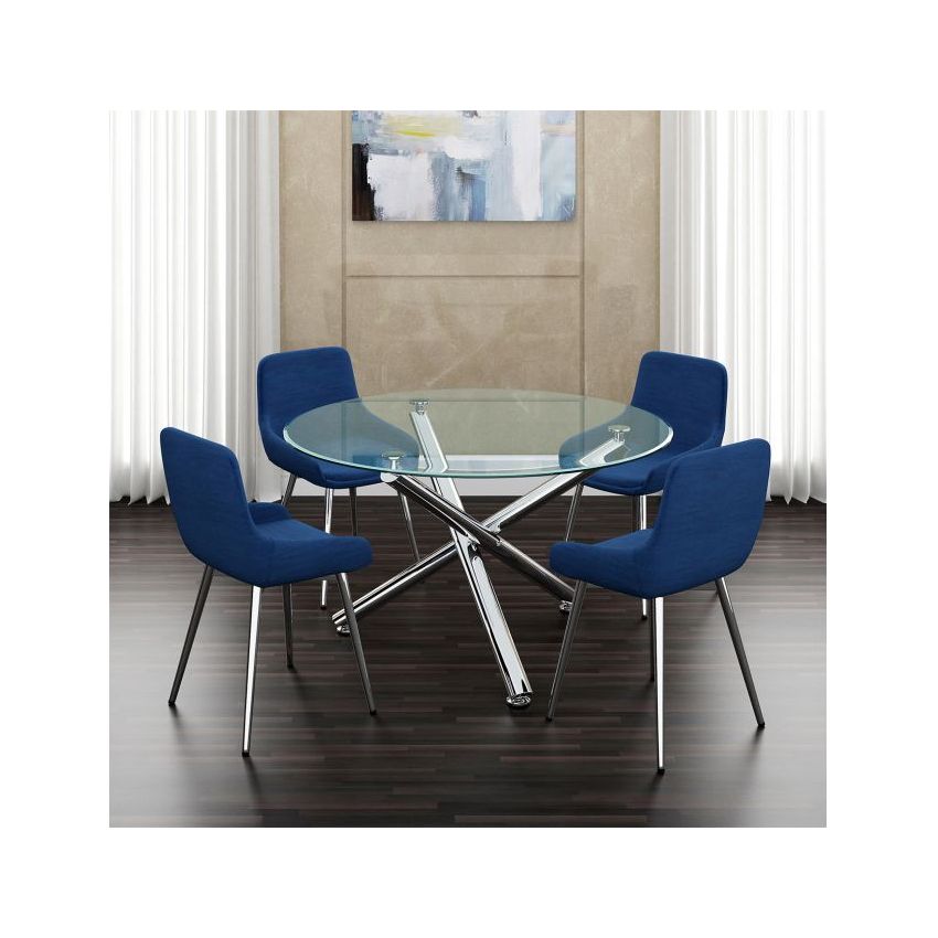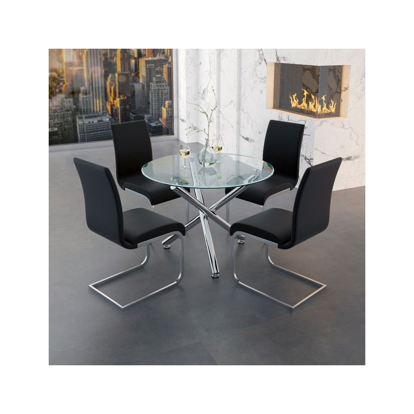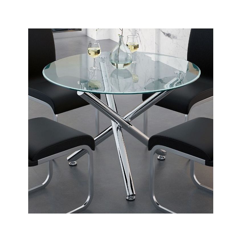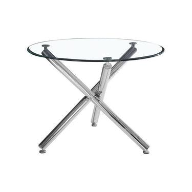 Contemporary beauty that is ideal for small spaces. The clear glass top and airy design create the impression of space. Chromed metal legs provide sturdy support. Great for casual dining.