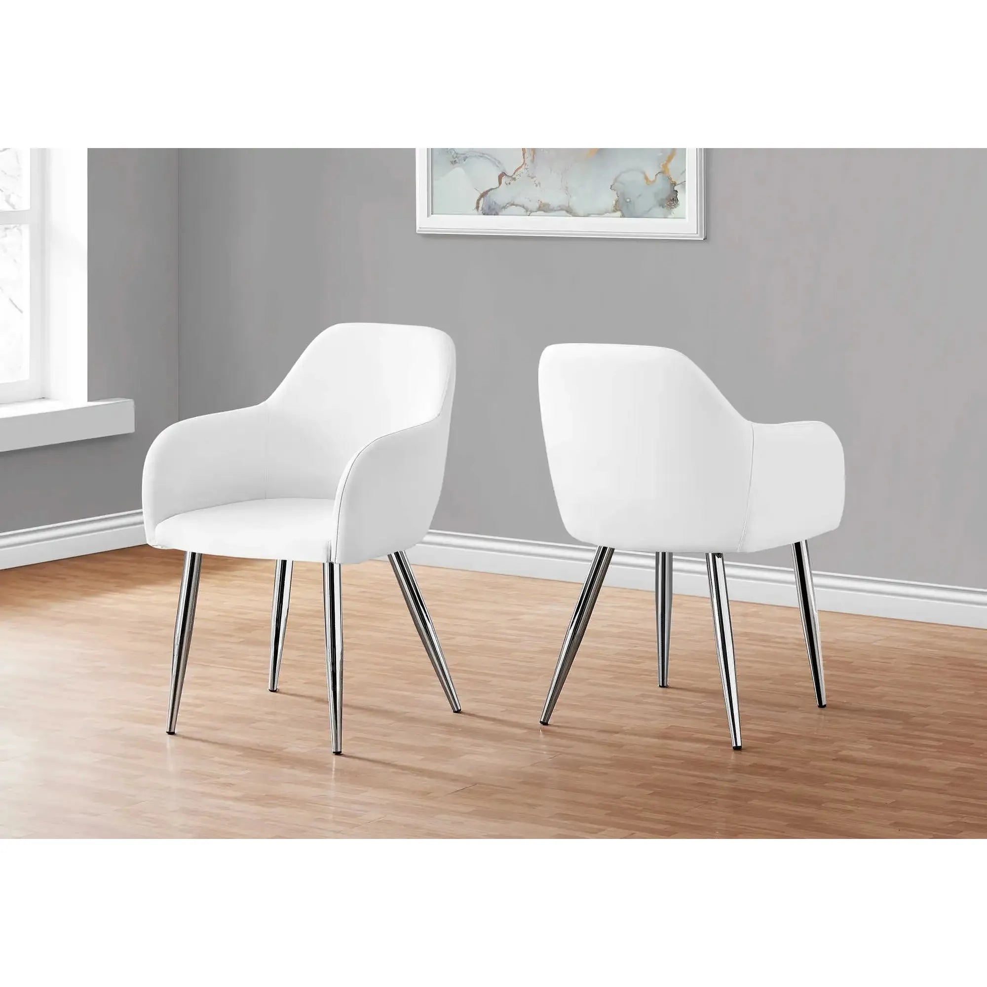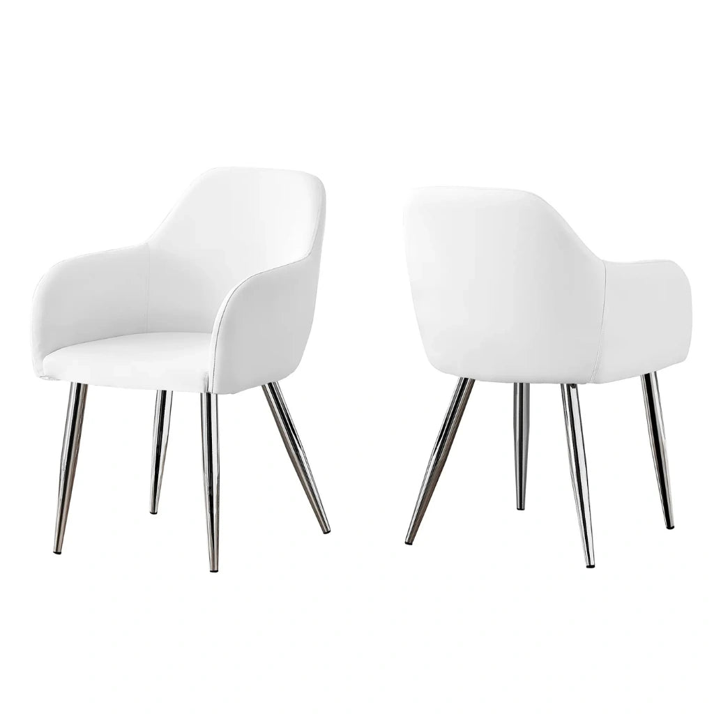 Bring comfort and style to your dining space with this set of 2 white leather-look dining chairs. These faux leather dining room chairs are delicately upholstered in smooth white faux leather material, ideal for both casual and formal settings. The curved, padded back and sides provide excellent support, while the cushioned seat ensures comfort during meals or conversations.