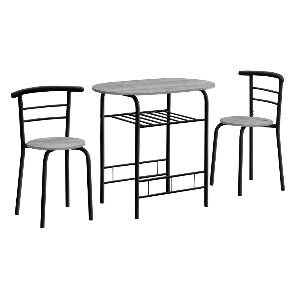 If you are looking for a 3 piece dining set in Montreal, Canada, then this oval grey table and black metal ladder-back chairs set can be a good option for you. This 3 piece dining set includes one table and two chairs. The oval table is crafted from manufactured wood, and the chairs feature a ladderback design with tubular metal detailing. The small dining set for 2 people is designed to save space. It's perfect for small apartments, condos, or breakfast nooks.