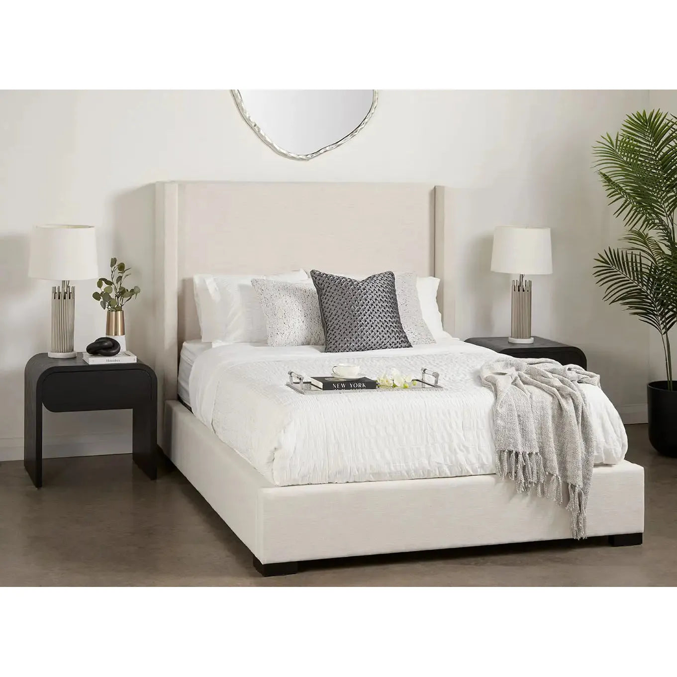 Sleep in luxurious style with the Wing Upholstered King Bed. This chic bed was designed with soothing beige fabric to create the perfect haven in your bedroom. Complete with a lofty wingback headboard. This luxurious upholstered king bed strikes the exact right balance between modern style and warmth.