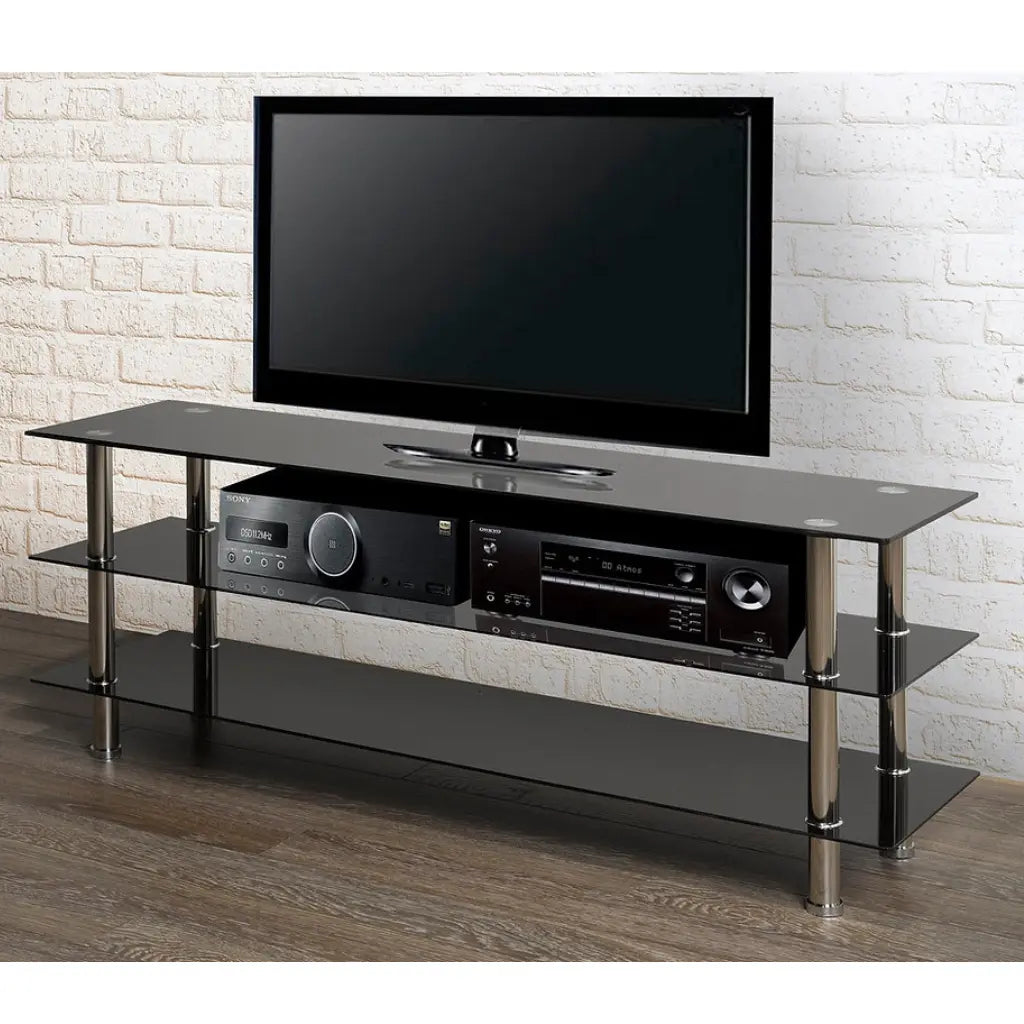 Black glass TV stand with chrome legs on a white background