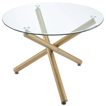 Entertain in style with the Carmilla Round Gold Glass Dining Table – a combination of glamour and contemporary design. With its clear 40" round tempered glass top and aged gold crossover metal legs, this dining table is the perfect modern addition to any dining or kitchen area.