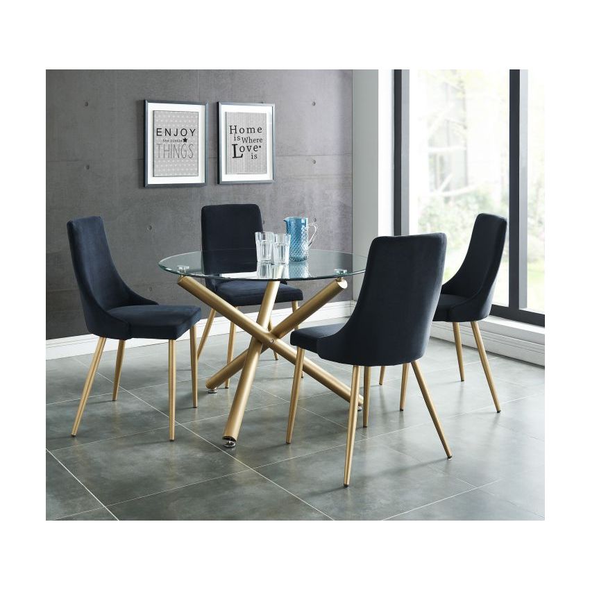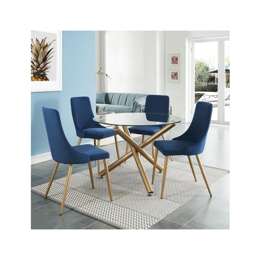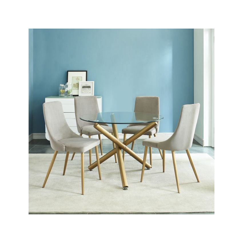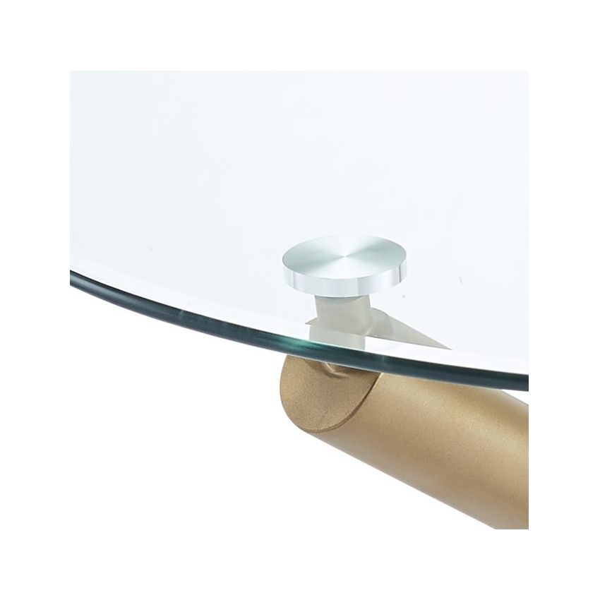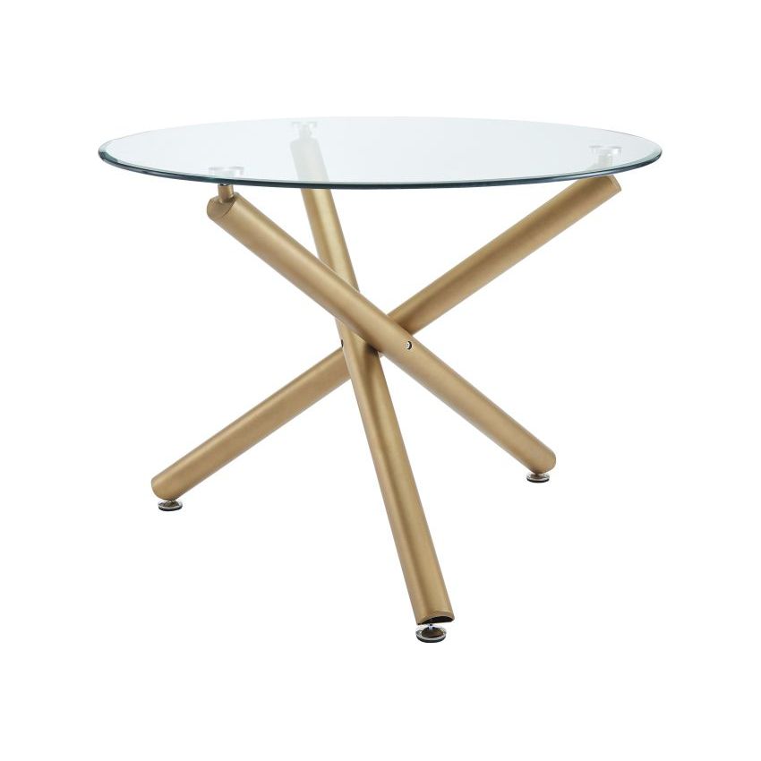 Combining metal and glass elements, this dining table is the perfect match for a variety of different chair styles. Incorporating a 10mm tempered clear glass tabletop on top of metal legs that have a matte aged gold finish, the illusion of crisscrossing geometric shapes makes this piece a conversation starter. Detailed with chrome-finished glass holders and table feet, this dining table seamlessly blends a fun and visually interesting appearance with a captivating style. A perfect place to gather for meals, formal or casual.