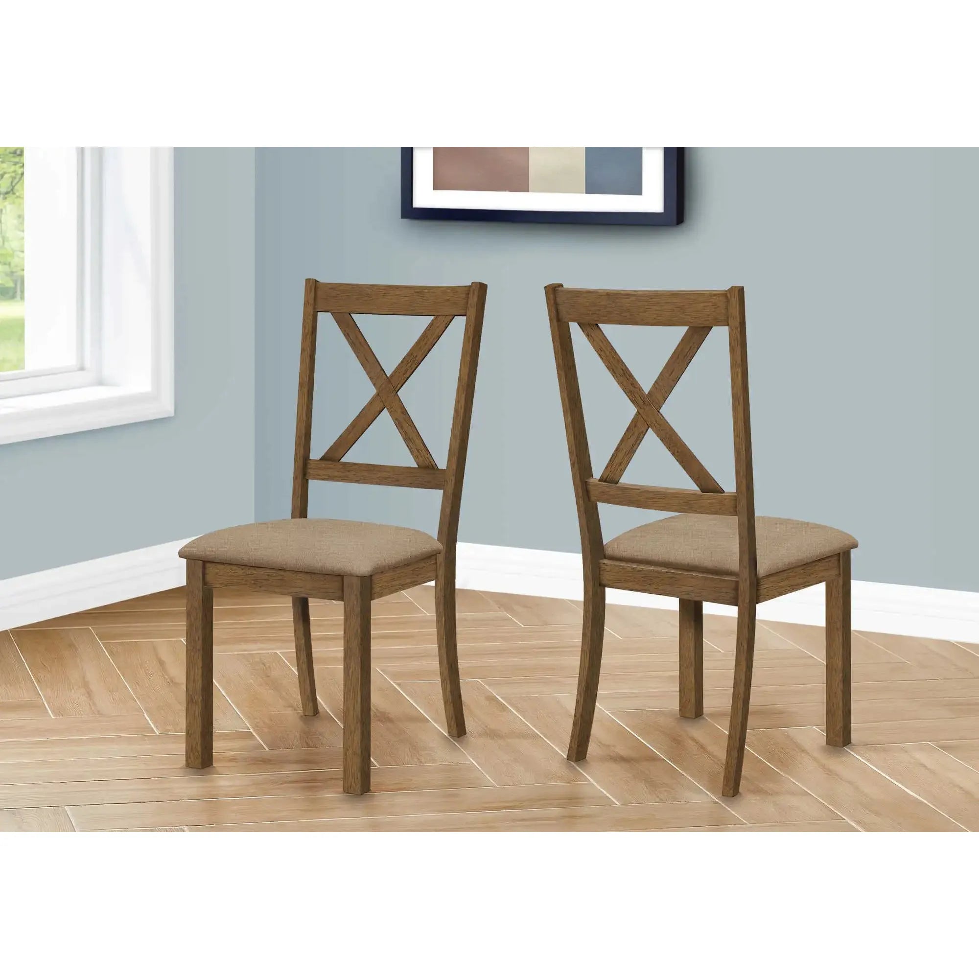 Cross Back Dining Chairs – Brown Fabric, Walnut Finish -Set of 2