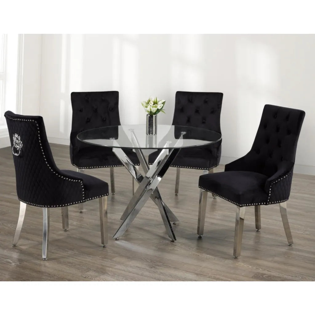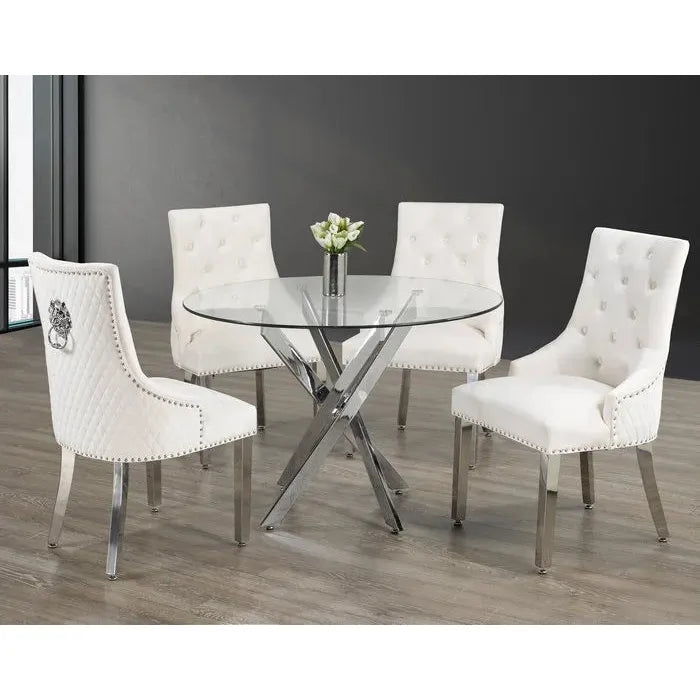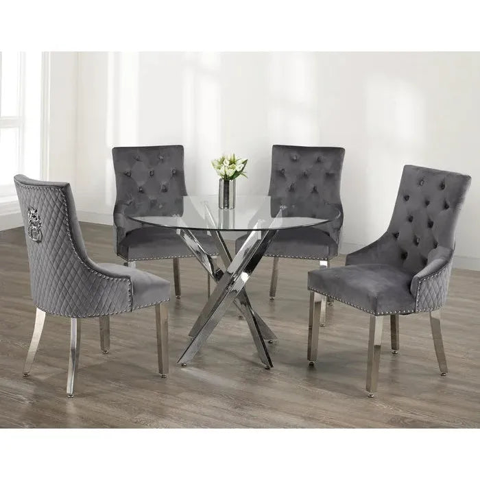 Pull up one of the four velvet chairs. Available in black, grey, cream, or blue velvet. Each chair features a quilted back, button tufting, chrome frame, nailhead trim—and a distinctive lion knocker at the rear. They’re artful. They’re comfy. And they add personality to your dining room. This set is chic, but welcoming. Perfect for intimate dinners or casual brunches. It’s designed to elevate your meals—and your everyday moments.