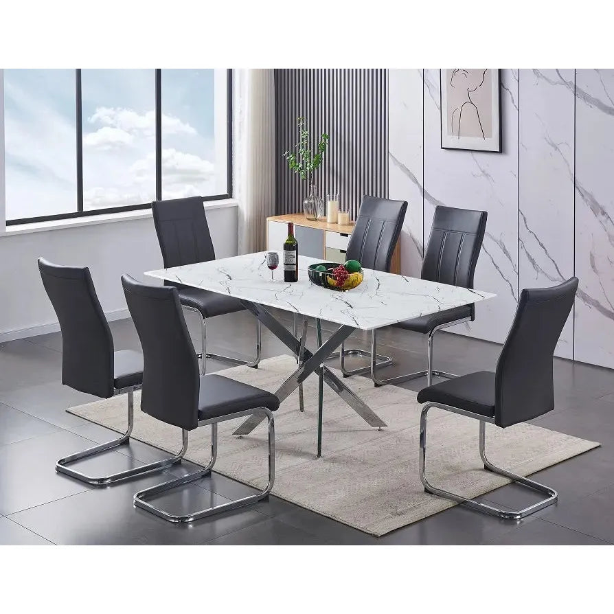 Home Dining Set with Tempered Marble Glass Table & PU Chairs For 6