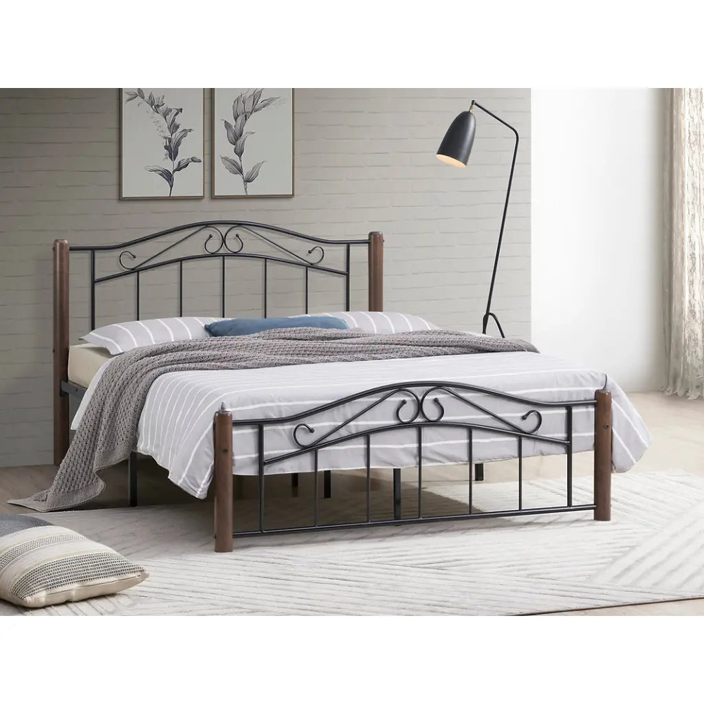 Double Bed Frame with Mattress Support – Black Steel & Walnut
