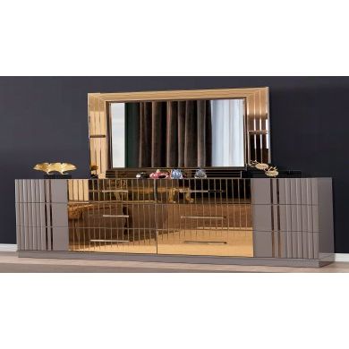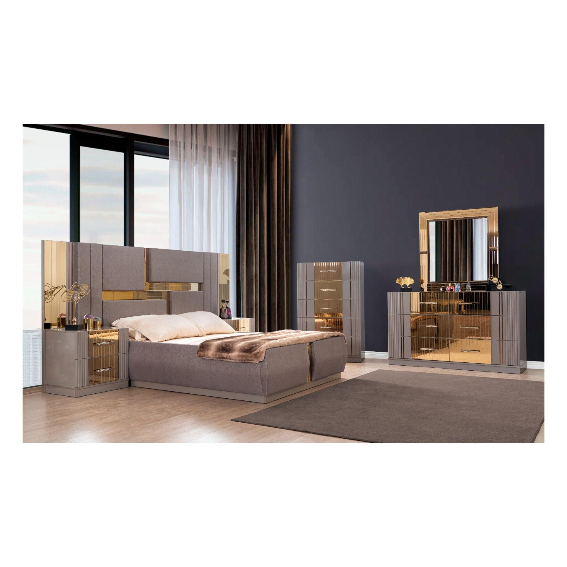 Offrez-vous un luxe incomparable avec cet ensemble de chambre à coucher moderne époustouflant de 5 pièces, conçu pour transformer votre espace en un havre de paix haut de gamme. Conçu pour les amateurs de sophistication et de glamour, cet ensemble comprend un lit rembourré moelleux, une commode, un miroir, une table de chevet et une commode, tous ornés de superbes touches de miroir doré et d'une élégante finition brillante. La tête de lit au design architectural, associée à des surfaces réfléchissantes et à des détails métalliques raffinés, confère élégance et prestige. Avec ses tiroirs spacieux à fermeture douce et ses matériaux haut de gamme, cette collection offre l'équilibre parfait entre modernité et fonctionnalité au quotidien.