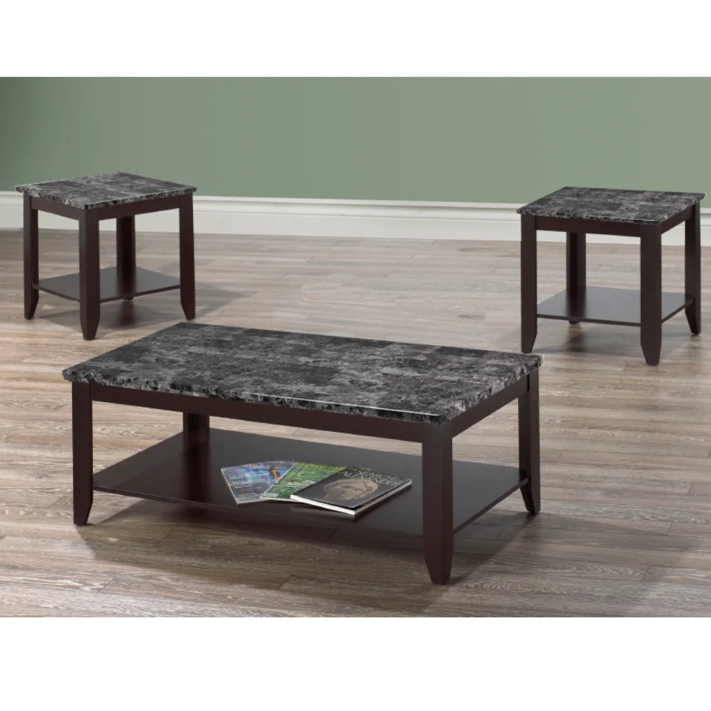 Step into comfort with this espresso coffee table set. It’s a practical 3‑piece arrangement: one coffee table paired with two end tables. The espresso wood frame adds warmth and elegance. The faux grey marble tops feel luxe without the weight or high cost. You’ll appreciate the open shelving beneath each tabletop. It’s ideal for books, baskets, or stylish storage. Clutter stays organized. The look is transitional. Clean lines meet modern finishes, making this set versatile for multiple décor styles. Build materials are engineered wood and faux marble veneer. It’s both durable and cost‑effective. A great mix of quality and value.