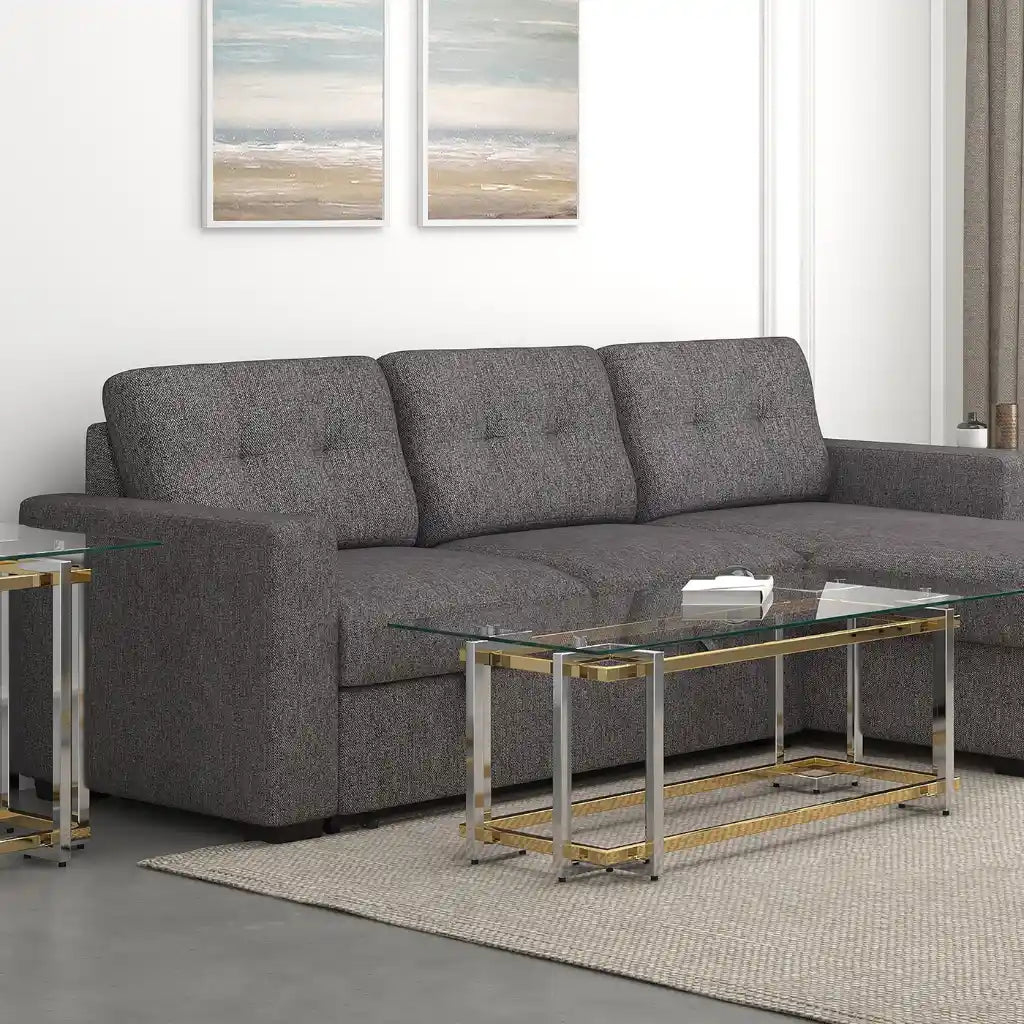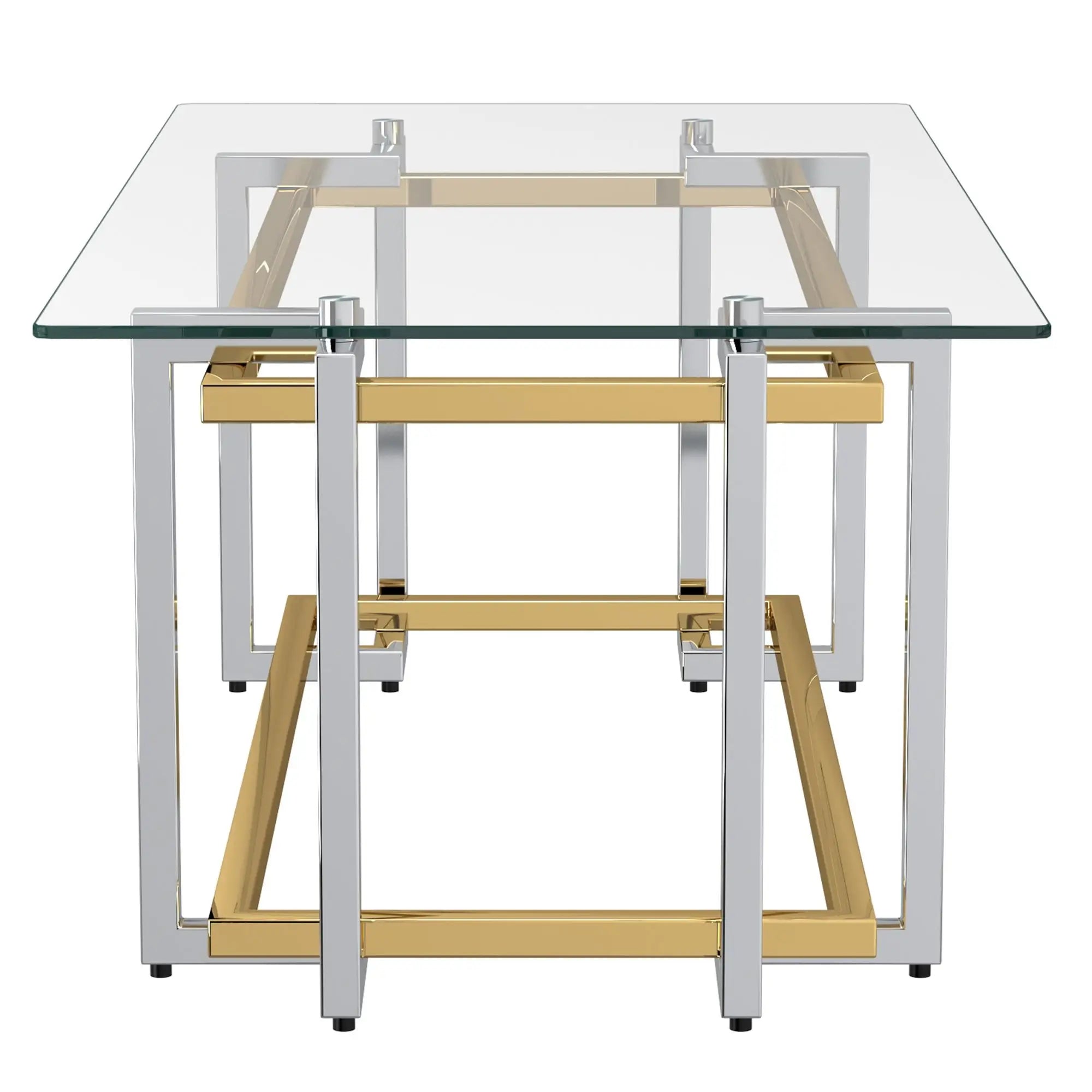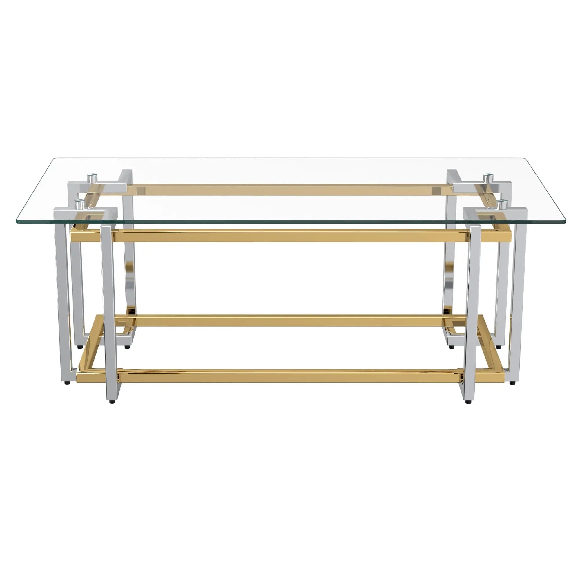 Make your living room a display of modern sophistication with the Florina Modern Glass Coffee Table. This arresting modern glass coffee table combines geometric art with luxury modern design. Available in rectangular and square shapes. It’s made with a polished metal frame with a sleek, two-tone silver and gold-tone finish that instantly adds a stylish touch to your home. With an open design and a clear 8mm tempered glass top, your place is going to feel more open, airy, and bright, but you still get a solid surface that's perfect for anything from decor to drinks. The distinct interlaced metal design of the Florina generates dazzling reflections, seizing the attention of the focal point of living spaces. Great for formal entertaining or to update any casual space, the features of this stylish coffee table always keep it current.