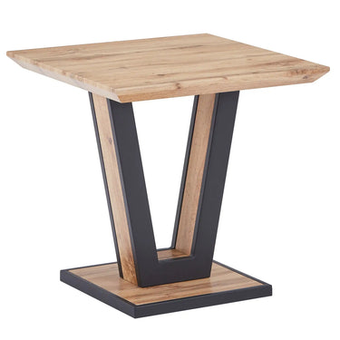 Add a modern touch to your living space with the Forna contemporary wood top side table. Statement-making sideboard with modern design and natural texture. The thick, inverted beveled tabletop is impressive with wood grain details and a contrasting black painted steel base in a dramatic triangular shape.