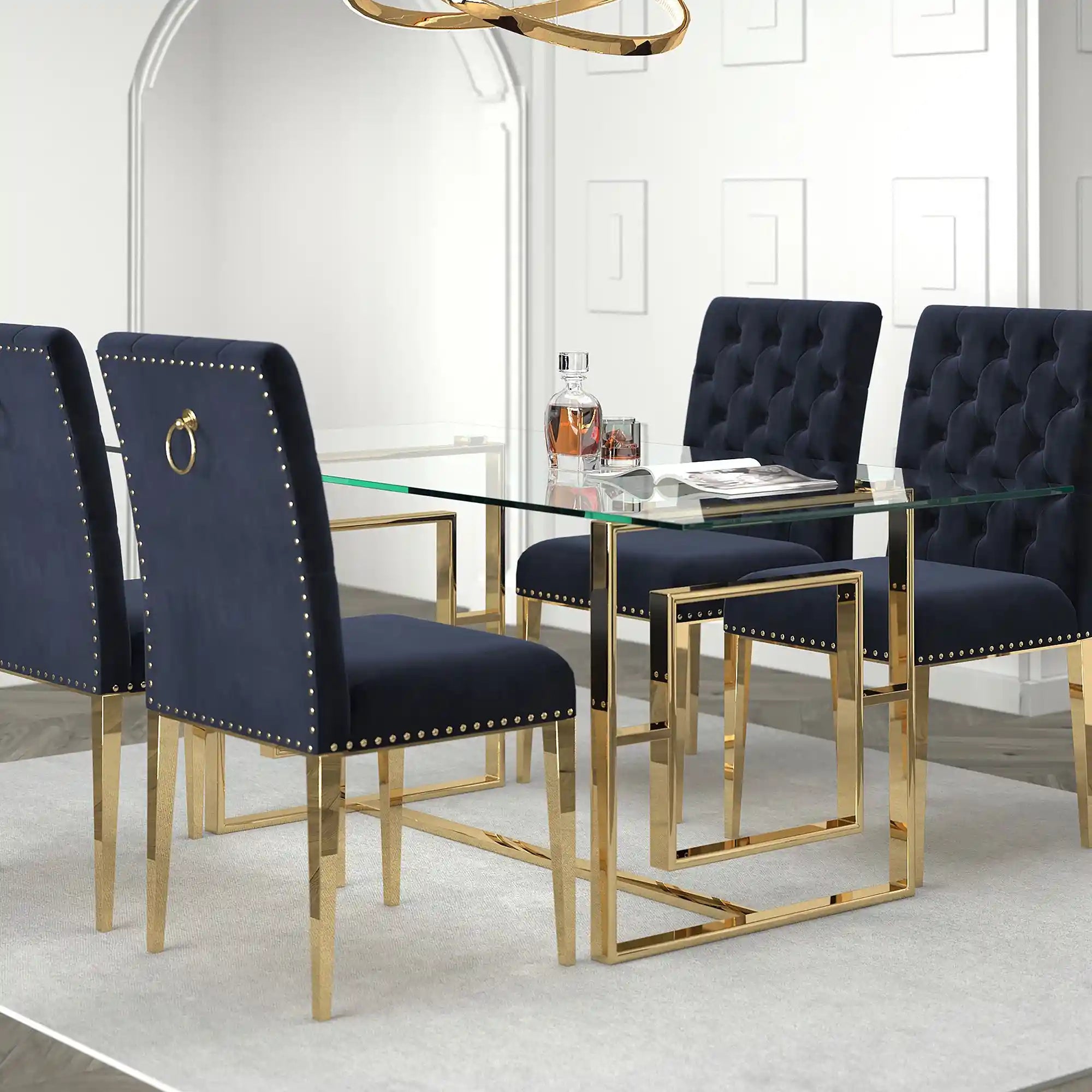 A polished gold stainless steel frame is Art Deco-inspired and oozes with sophistication, while an open base design maintains an open-concept feel, making it the ideal choice for small spaces or open-concept living. This glass dining table comfortably seats up to six guests. Whether it’s a family dinner or a formal dinner party, it’s sure to be the center of hospitality.