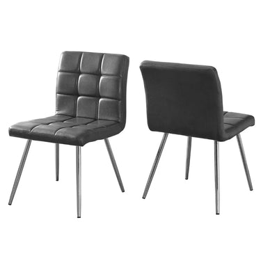 This faux leather dining room chair is delicately upholstered in smooth grey faux leather material with a trendy quilted pattern. This can ensure you a comfortable seating experience. The chrome metal legs provide excellent stability.