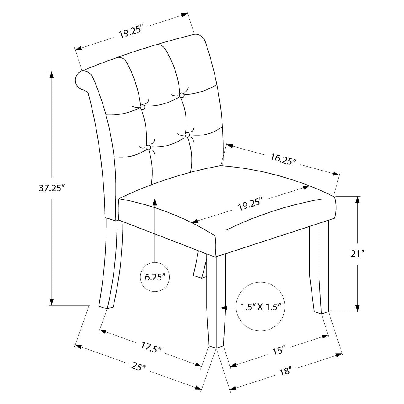 Seat height: 21"; seat dims: 19.25". W x 16.2". D;