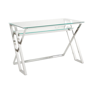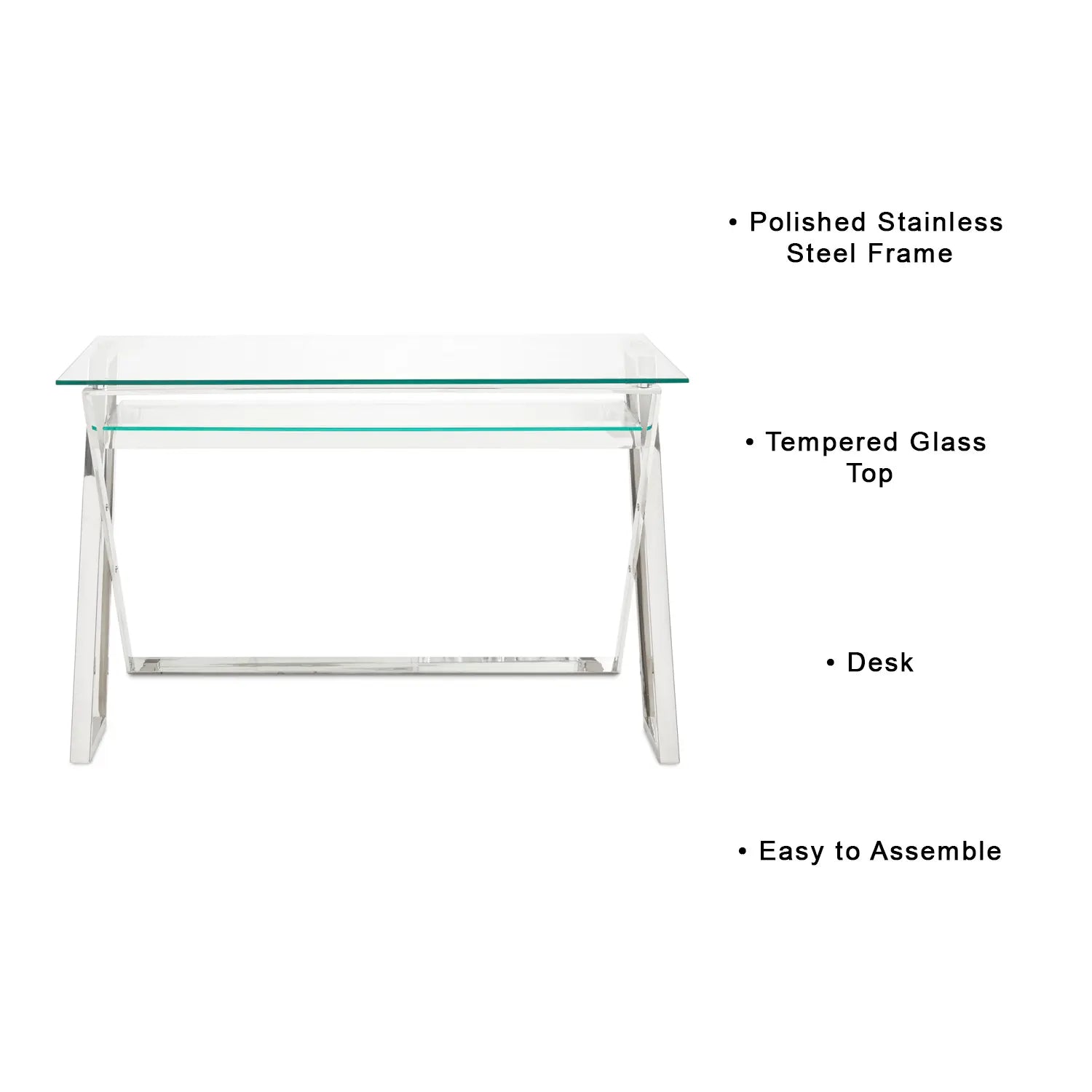 Chic and elegant with a tempered glass top and polished stainless steel or frame. The modern glass office desk is perfect for a glamorous home office or for adding a bold statement to your bedroom or office. It’s small enough for a condo, apartment, or smaller space without sacrificing good looks and the functionality you need.