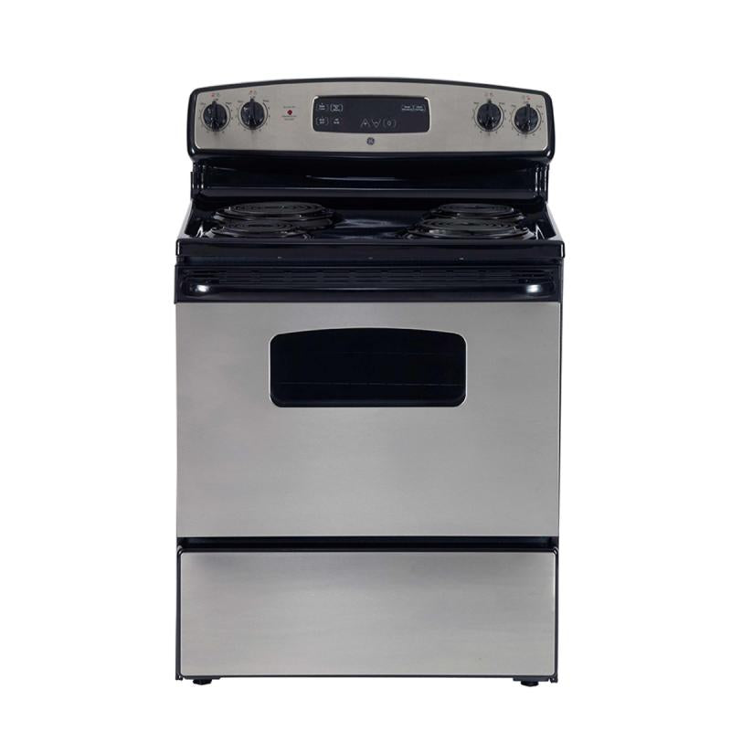 The GE 30-inch electric range features 4 coil elements, a storage drawer, and a 5.0 cu ft. oven capacity. It comes in Stainless Steel color.