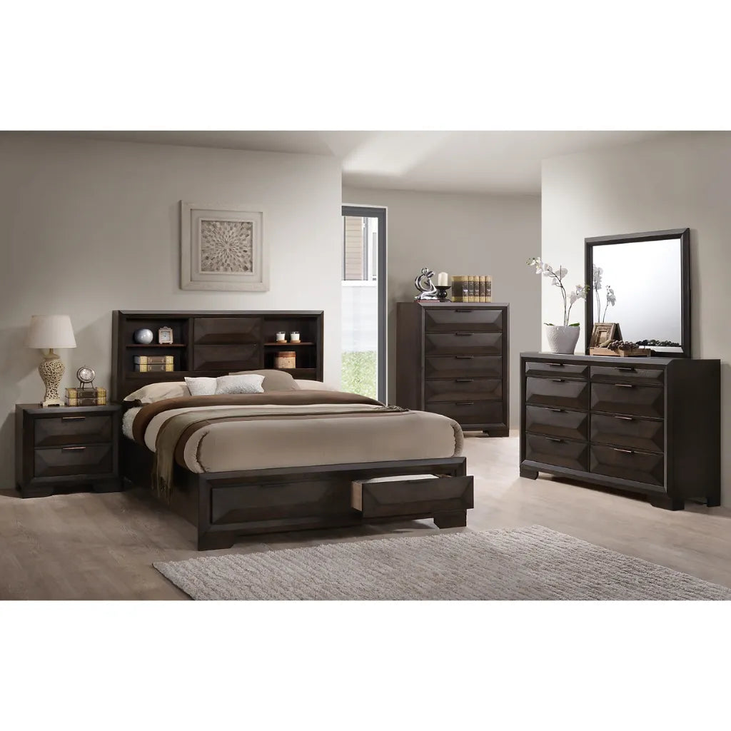 The full set includes a queen or king bed, dresser, mirror, chest, and nightstand. Together, they offer plenty of storage and a balanced look that fits both modern and transitional bedrooms. Smooth lines, thoughtful proportions, and durable construction make it a set designed to last.