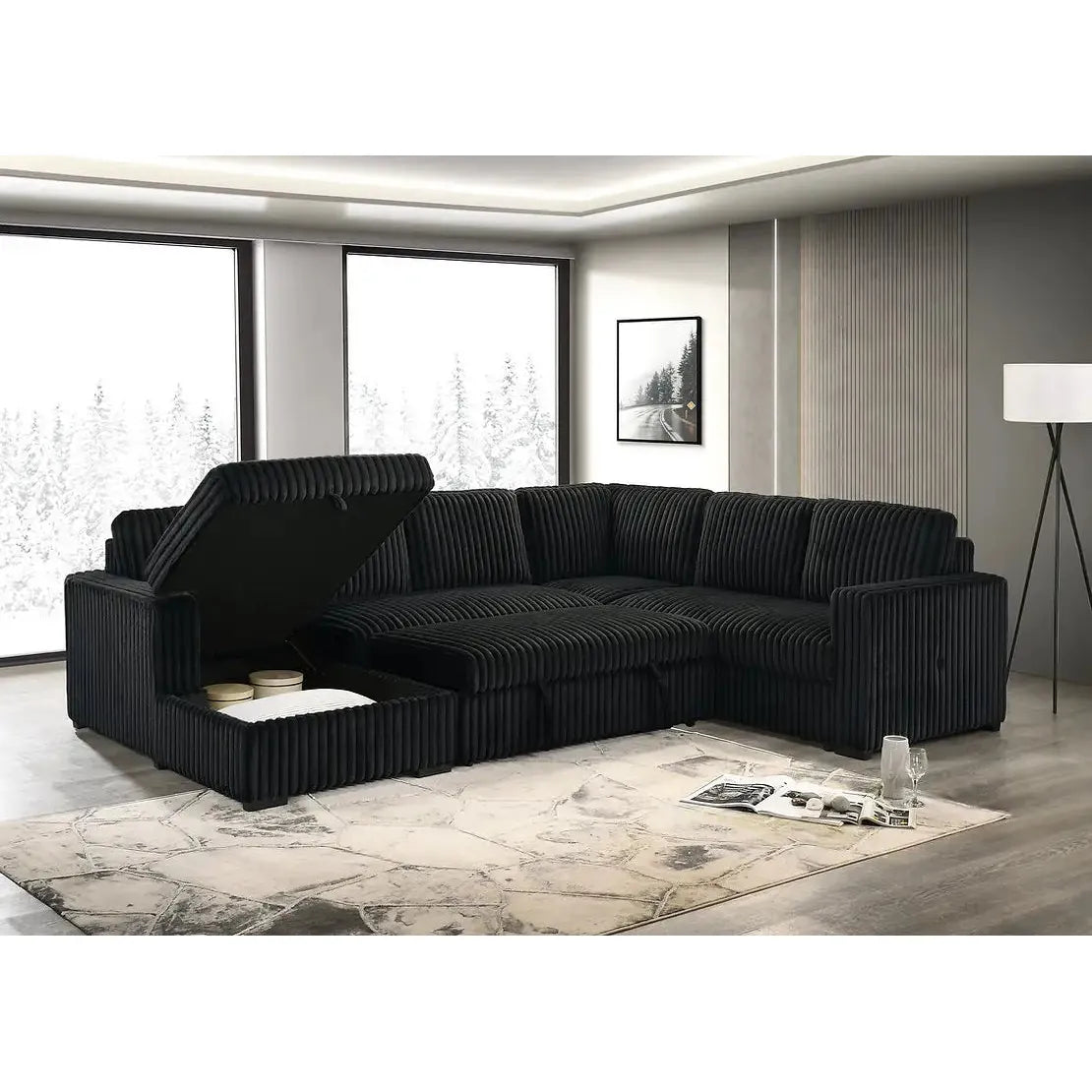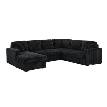 Stretch out in total relaxation on the left-hand facing chaise, covered in luxurious soft black corduroy fabric that feels as cozy as it looks. Need extra room for guests? This sectional transforms seamlessly into a bed, offering an inviting place for overnight stays.