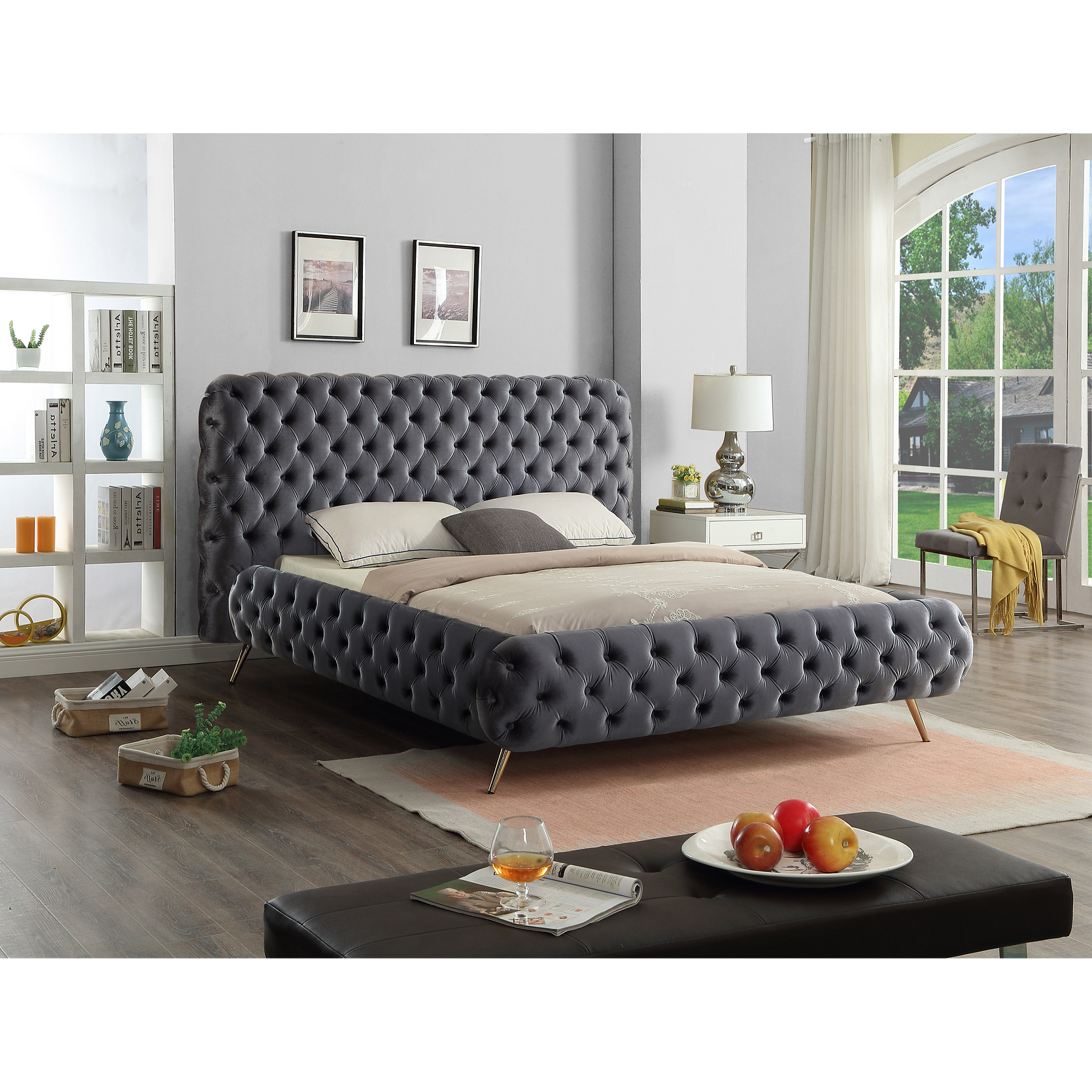 Lit en tissu velours gris avec capitonnage à boutons extra profond et pieds chromés élégants