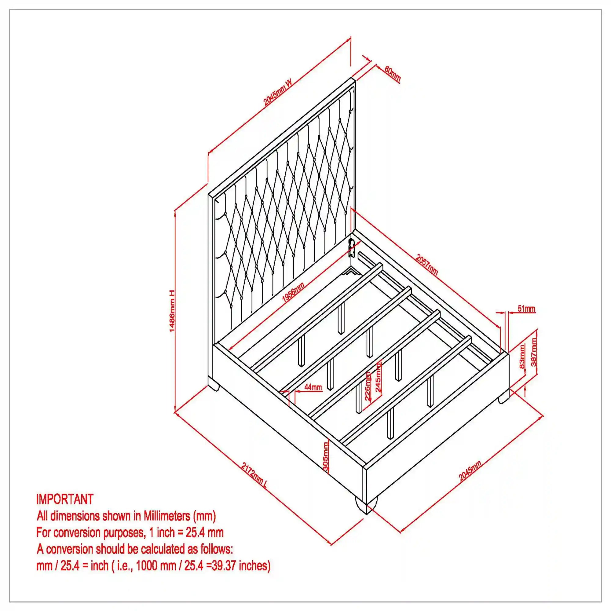 - Diamond Tufted Headboard: Stylish detailing with mirror trim, polished stainless steel