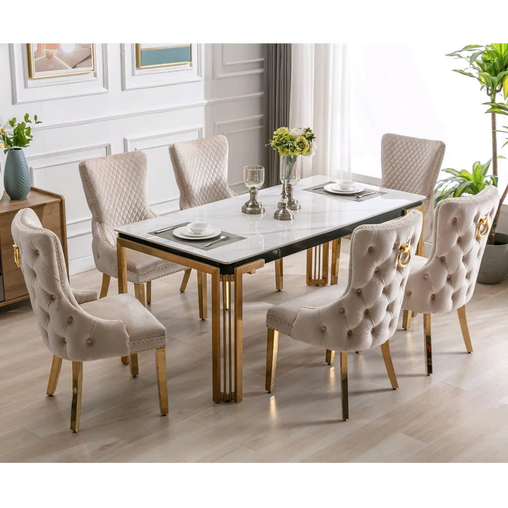 - 7-piece luxury dining set: ceramic marble top table + 6 velvet chairs