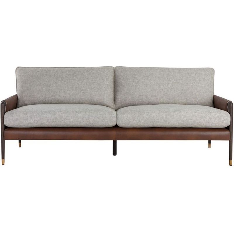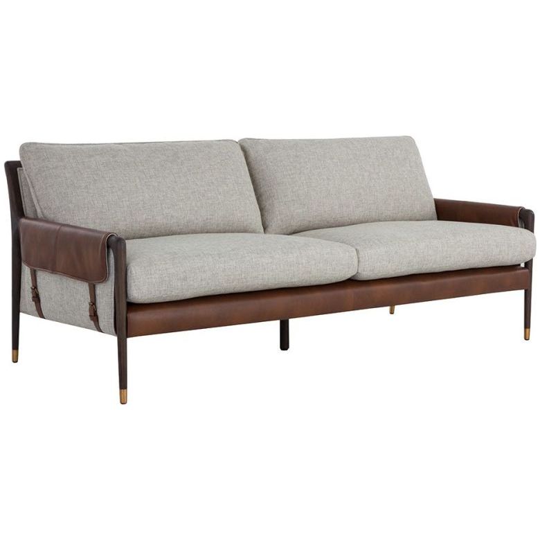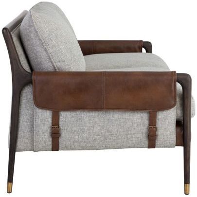 With influence from vintage design, this sofa evokes a charming and rustic mid-century appeal. Upholstered in vault fog fabric with accenting bravo cognac faux leather. Features dual buckle flap detailing on the armrests and completed with a brown solid oak wood frame with gold finished metal foot caps. Handle With Care: This design has been crafted with faux leather. Faux leather is manufactured to reflect the natural characteristics of leather; as such, colour variations, markings wrinkles, grooves, and light scratches are appreciated characteristics. No two pieces will be alike. Visit our Product Care page for more information on how to ensure the lasting beauty of this piece.