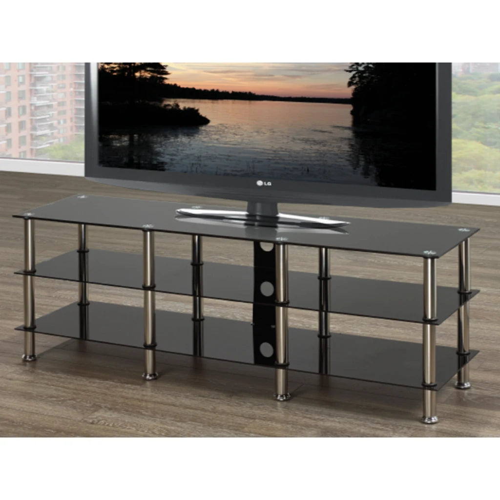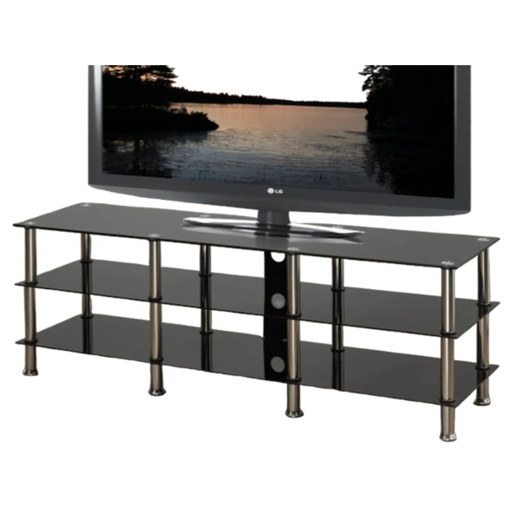Modern 59” Wide Black Glass TV Stand With 3 Shelves And Chrome Legs