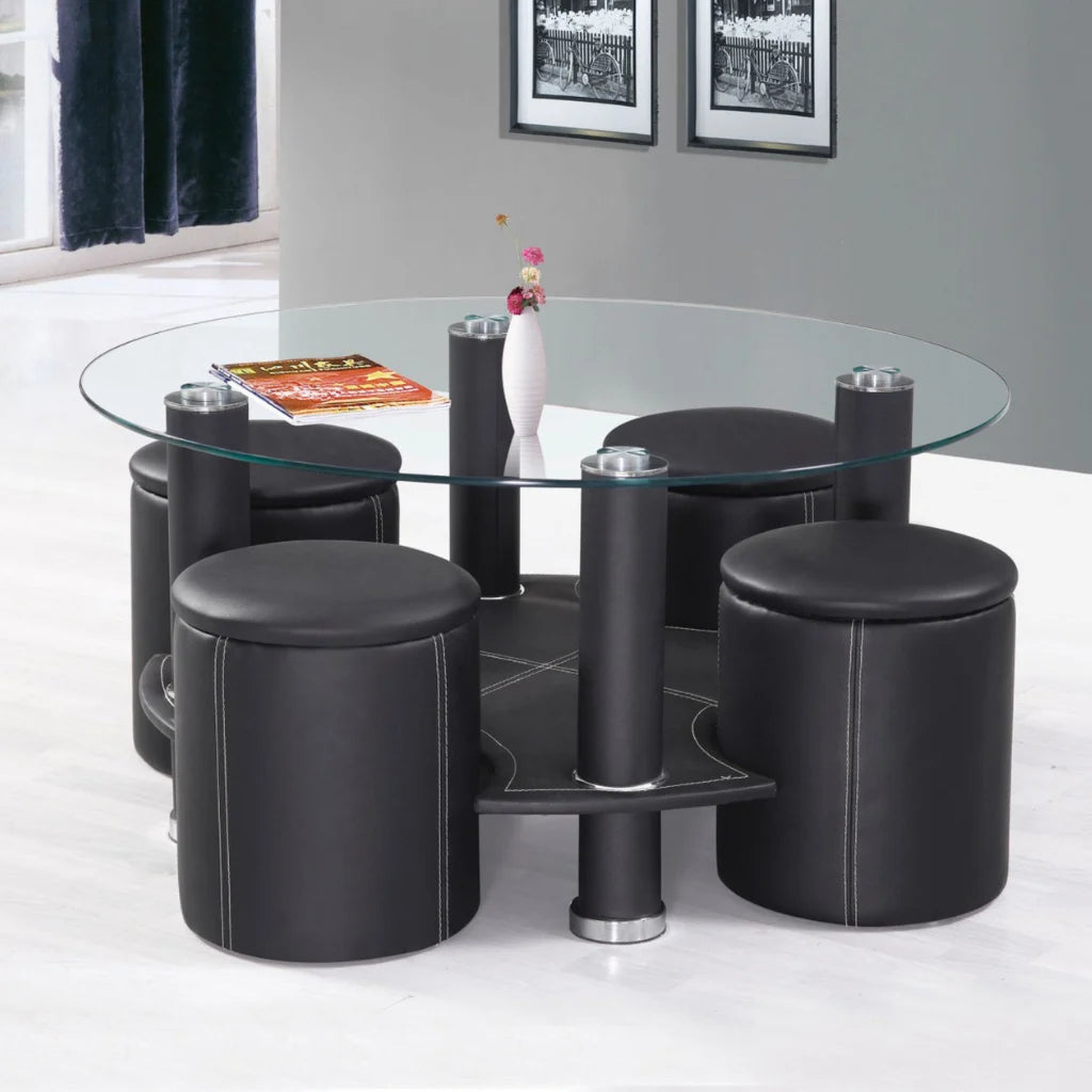 Modern Black Tempered Glass Coffee Table Set with 4 Stools