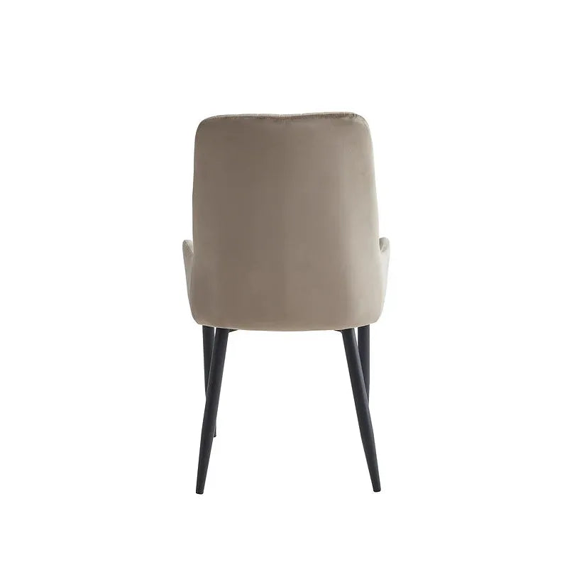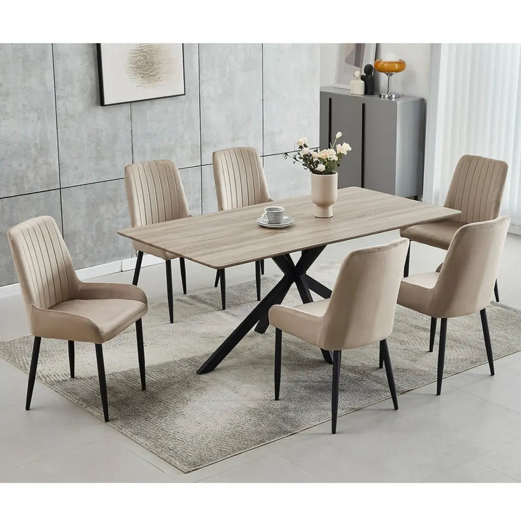 Six chairs complete the look. Choose between beige velvet upholstery or grey/beige fabric—both with refined stitching details and durable black steel legs. They are comfortable. Inviting. Ready for conversation.