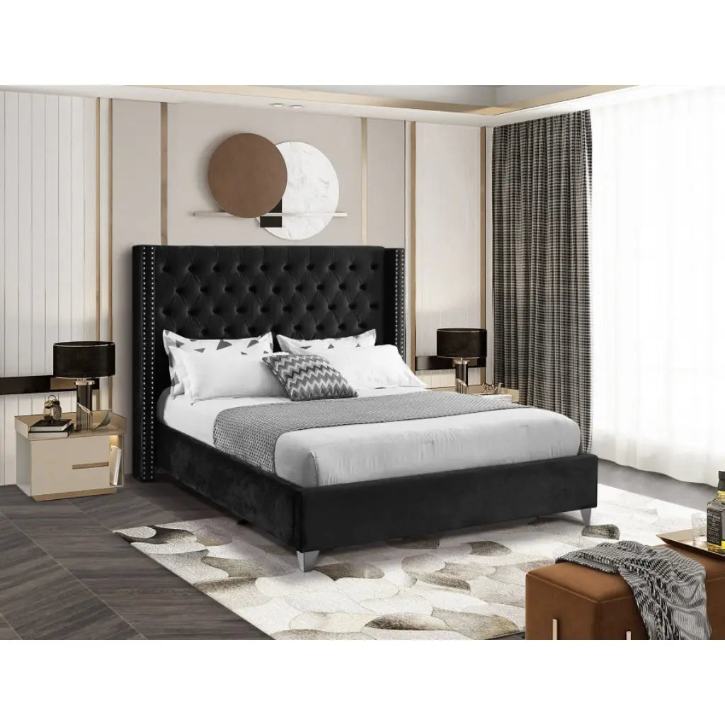 • Headboard Design: Deep button tufting with chrome nailhead trim