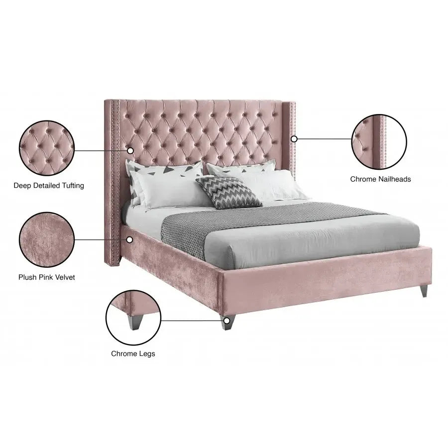 Pink Velvet King Platform Bed with Tufted Headboard & Chrome Legs