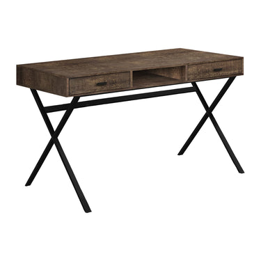 This industrial-style desk is finished in a brown, rustic wood look. This Brown wood look desk is equally functional as a computer desk, writing table, or office desk. The Small space desk is suitable for small homes, apartments, or offices. The black metal X-design is to ensure stability and a comfortable work environment. This Industrial office desk has two convenient and easy-open storage drawers. The Small space desk is compact and the thick panel top has the perfect amount of surface space for a laptop/tablet, lamp, notebook, and some important supplies.