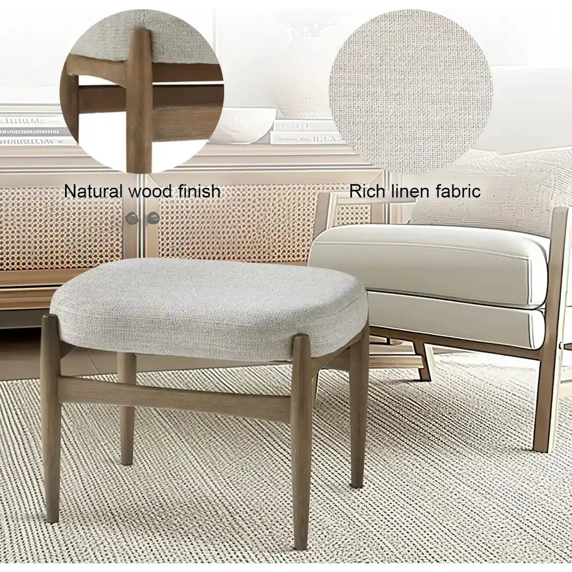 This linen polyester fabric ottoman is wrapped in cozy linen polyester fabric and is based on solid wood legs to add elegance to whatever room you style it in. Its small footprint and size allow you to keep it under your bed or in your hallway or living room as well.