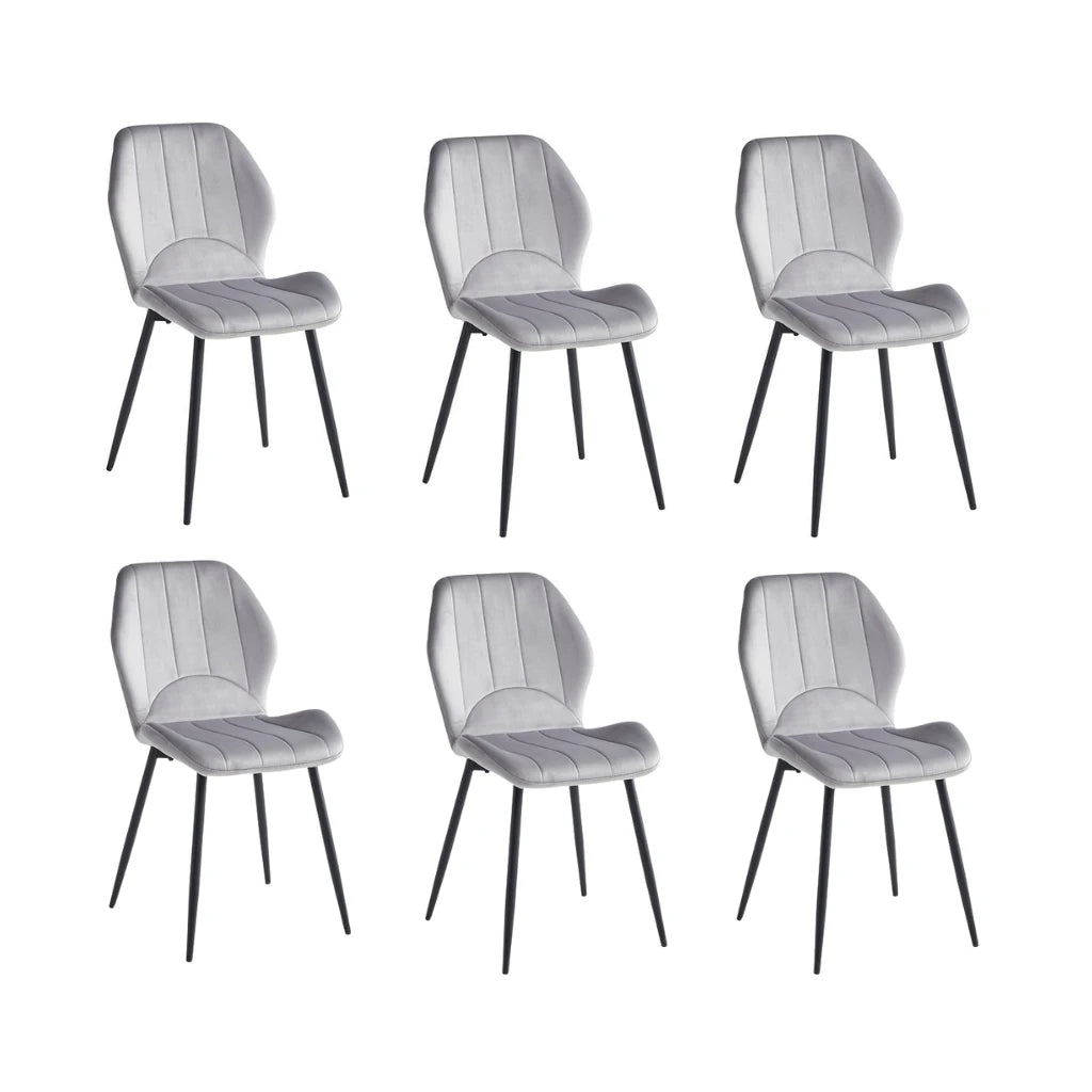 Elevate your dining room with this stylish set of 6 grey velvet chairs that offer comfort and charm. With their soft grey velvet upholstery and sturdy black steel legs, these dining chairs strike a balance between sophistication and strength. The modern finish enhances the elegance of your table setting, while the plush seat ensures your guests stay comfortable through every meal. Whether you're redesigning your space or adding seating for a large gathering, this set makes a striking and functional choice.