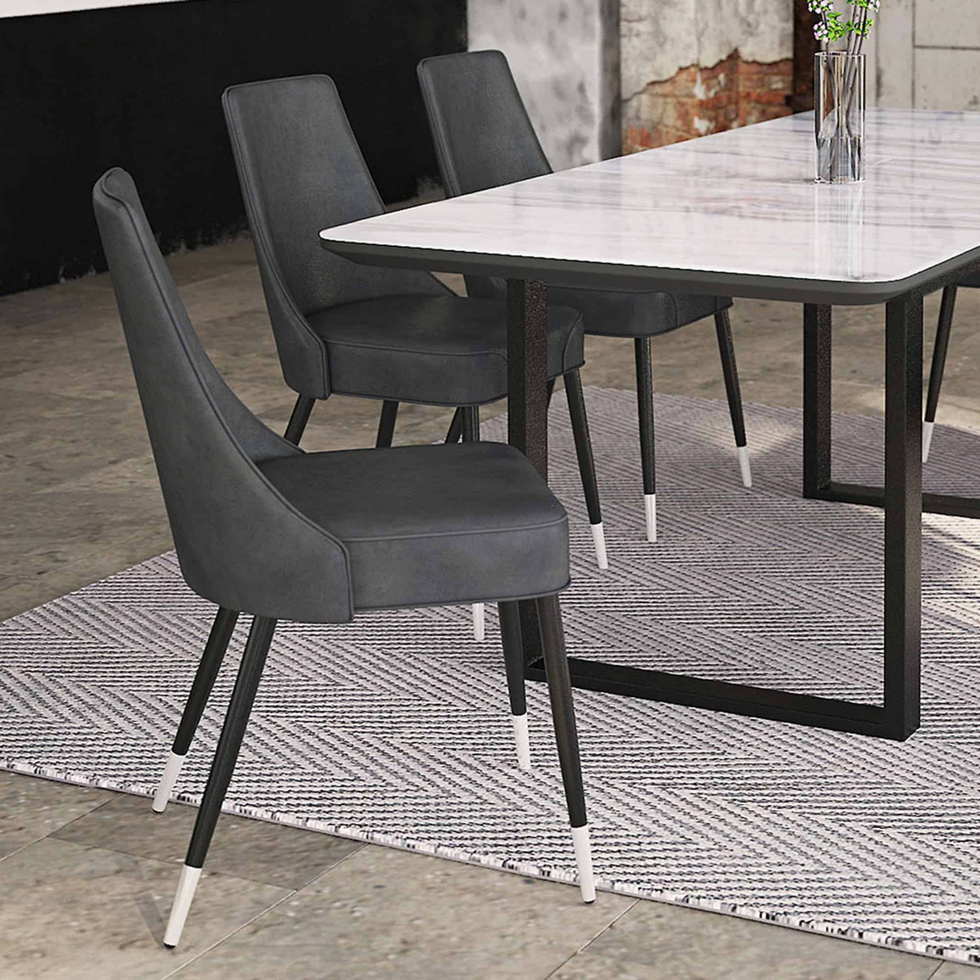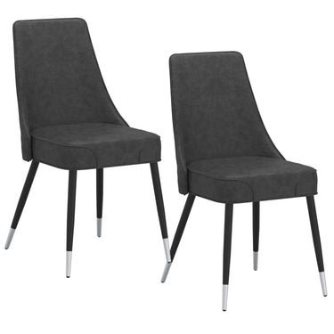 Add a designer touch to your dining space with the Silvano Side Chair, in Vintage Grey and Black. The Faux leather dining chair Features a mid-century modern design. These oversized dining chairs feature grey faux leather upholstery and stylish piping on both front and back, which brings a timeless look. The black metal legs of this Comfortable side chair are accented with a chrome finish at the base, offering durability and a sleek finish. It's Ideal for casual or formal dining rooms, kitchen tables, or even accent seating.