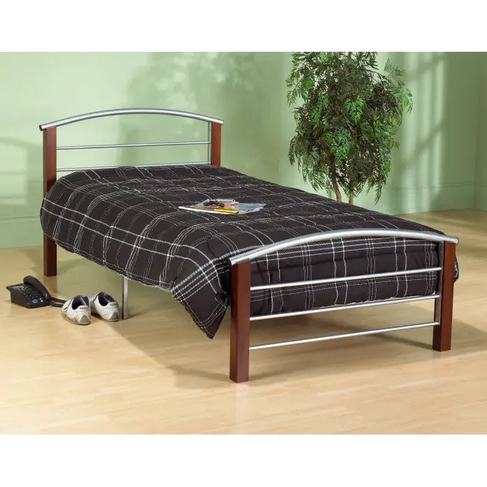 Home Silver Metal Single Bed Frame with Espresso Posts