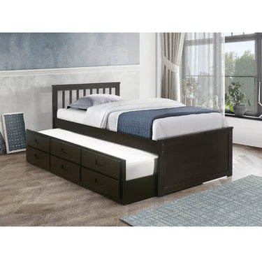 Crafted in a rich espresso finish, this twin-size frame offers a timeless look that works in both kids’ rooms and guest spaces. The pull-out trundle makes hosting overnight visitors simple — roll it out when you need it, tuck it away when you don’t. Easy, seamless, stress-free.