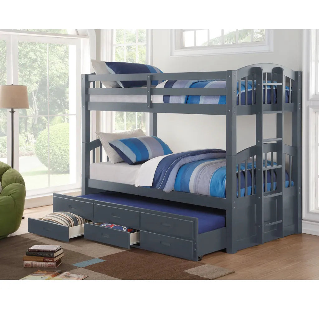 Grey bunk bed with blue bedding