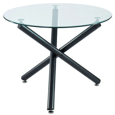 Enhance your dining experience with the Suzette round glass dining table. This 40-inch table combines a 10mm tempered glass top with strong matte black metal legs in a stylish crossover design that combines structural elegance and minimalism and is created for modern living.
