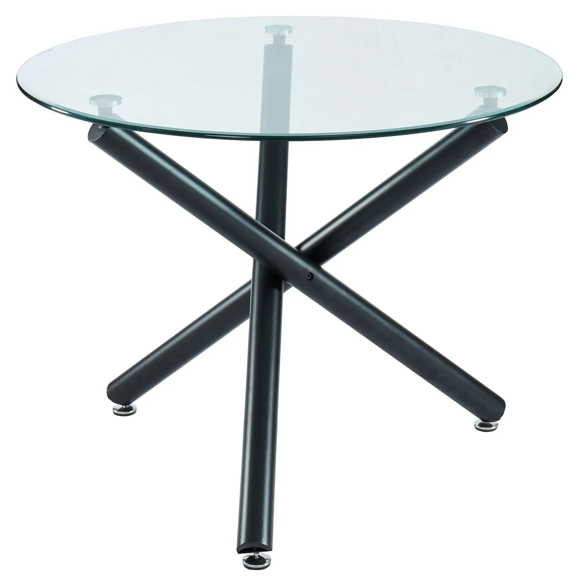 Let’s talk centerpiece: the round dining table features a 10mm tempered glass top that keeps your space feeling open and airy. It rests on matte black metal legs, accented with brushed stainless steel to add a designer touch. Sturdy, stylish, and easy to clean.