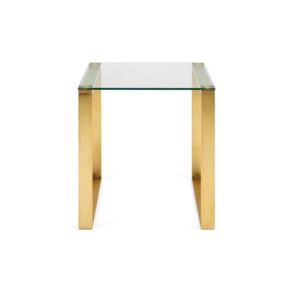 Add a touch of modern sophistication to your living space with this chic tempered glass end table. The David Gold End Table mixes clear and glam and looks fabulous in your home. The sturdy gold finish steel base of this table is like a star. It twinkles and shines from every angle. The clear and transparent table is the perfect addition to any room.