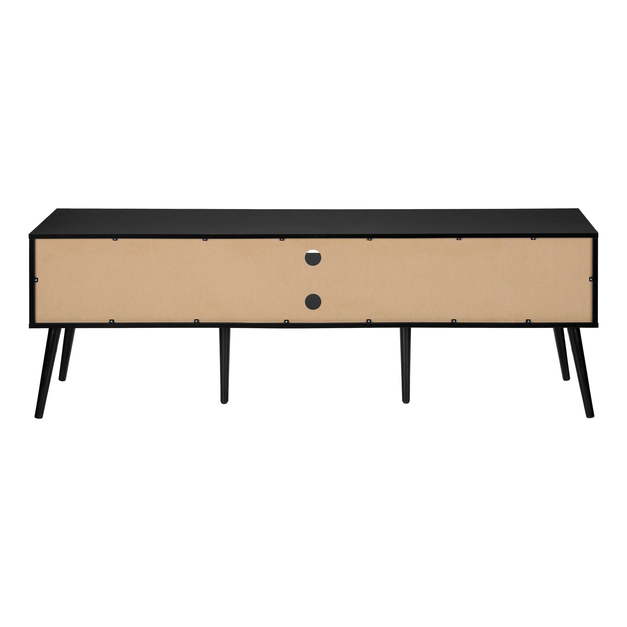 Introducing our sleek and stylish tv stand, the perfect addition to any trendy living space! This 72 inch black laminate beauty is not just a piece of furniture, but a statement piece that combines fashion and function seamlessly. Constructed with durably designed solid wood legs, this tv stand offers both open storage shelves as well as closed storage options to keep your space organized and clutter-free. The sliding doors with paneling on the storage cabinets add a retro style, while the easy cable management holes behind the fixed shelves showcase audio/visual components. With a fashionable style and an easy to clean top, this media console will be a practical addition to your home. Easy to assemble with hardware included, you can upgrade your living room or bedroom with this contemporary media entertainment center. Plus, with a 5 year limited warranty, you can trust in the quality and longevity of this solidly constructed piece.