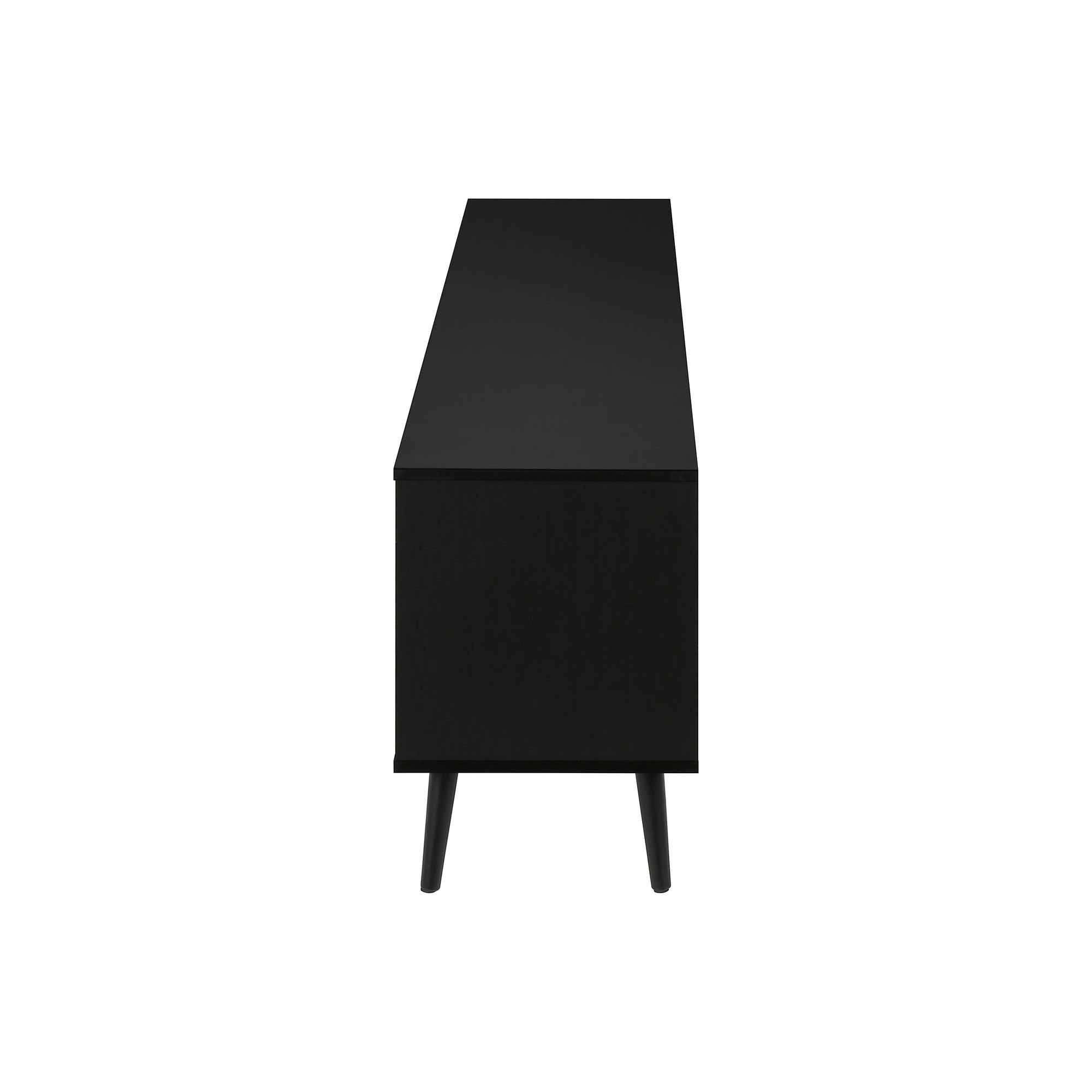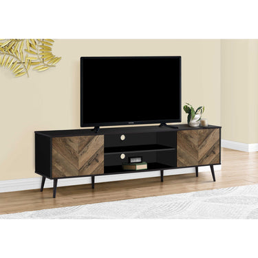 - This 72 inch contemporary tv stand, finished in a brown and black laminate and supported with sturdy black wood legs, makes an eye-catching modern statement in a living room, bedroom, or office space.